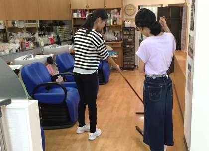 左)HAIR PLAZA。さすがに美容室。私服でお掃除をしています。
