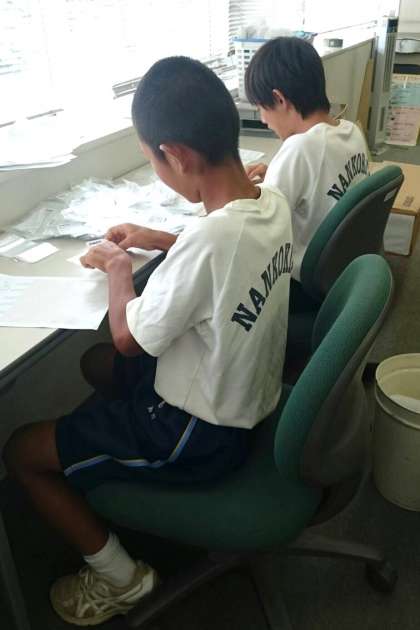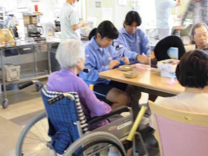 中)介護老人保健施設雅秀苑です。お年寄りと色紙で鶴を折っています。