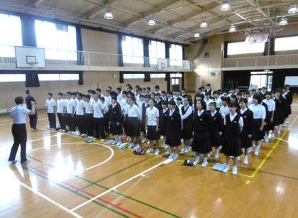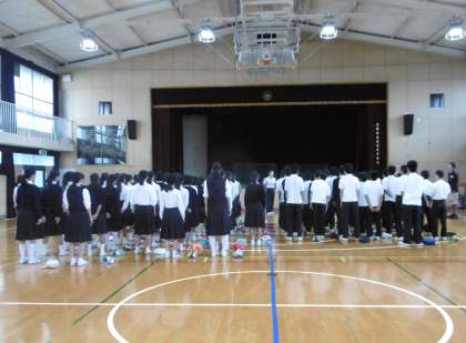 今朝の1年生学年集会は体育館で文化発表会の合唱の練習です。