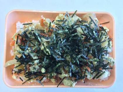 今日は玉ねぎとたけのこ、にんじん、三つ葉、しいたけが入っています。副食容器に入った具材をご飯にかけてのりをのせて完成です。