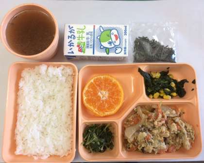 木の葉丼、ほうれん草とコーンのおひたし、水菜、みかんと牛肉の