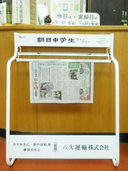 本校2期生の八大運輸(株)社長 有吉俊治 様から、「朝日中学生ウィークリー」1年分と、交通事故防止標語付き専用ラックと保存用ファイルをご寄贈いただきました。早速、図書室におき活用させていただきます。有吉様、ありがとうございました。