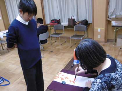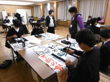 今年一年の決意を筆に込めて示す日本の伝統行事。師範にそれぞれ好きな言葉を手本に書いていただき、真剣に机に向かいます。