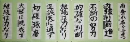 上は、1階渡り廊下の「元気アップ書道教室」の書初め作品です。なかなかの力作ぞろいです。力強い筆さばきが見事ですね。T先生の作品もありますよ。