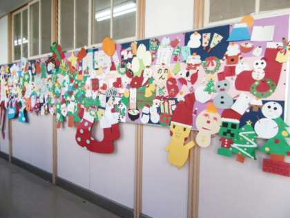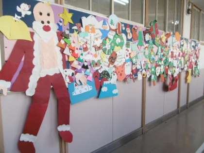 中と下は、美術部の共同作品「新年のオブジェ」です。にぎやかなキャラクターが楽しそうすね。3階美術室前にあります。