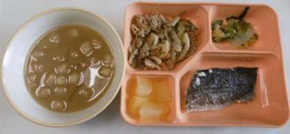 りんごの缶詰、ふ(白玉)と玉ねぎのみそ汁です。