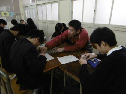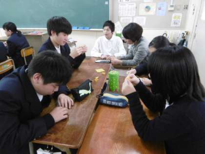 学年集会でA先生から作り方のレクチャーを受けたものの、おぼつかない手先の人が何人も!その一方では、意外な人が上手に折っていました。