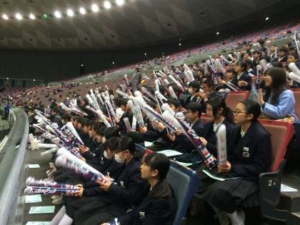 結果は72-40でオランダが快勝しましたが、応援グッズをもらった2年生、持ち前のノリの良さで両チームに大きな声で声援を送っていました。