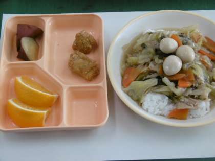 中華丼、うずら卵、鶏肉のから揚げ、さつまいもの甘煮、はっさくです。