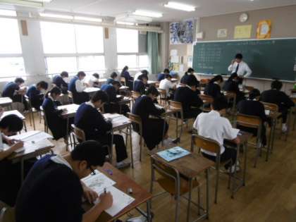 1限目から、国語、社会、数学、理科、英語の5教科の問題に真剣に取り組んでいます。