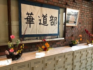 華道部、玄関まえにきれいなお花を活けてくれました。