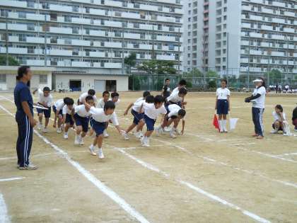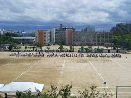 朝方までの雨でグランド状態が悪く、予定を変更して午後から予行を行いました。明日は予定通り8時50分開会で実施したいのですが、今後の雨の様子で変更する場合もあります。中止の場合は、午前7時30分に正門・東門・コスモスクエア駅に掲示し、はなまるメール連絡します。中止や判断に迷う時は、火曜授業の用意と体操服・昼食を持参し標準服で登校してください。