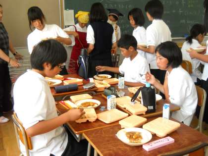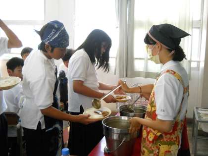 給食にあたたかい汁物の提供をということで、ミートボールカレーを保温食缶で提供しました。選択制の学年は、配膳室前で一人ひとりが食缶からふた付きの容器に取り分け、完全喫食の1年生は、教室まで当番が食缶を運びご飯にかけました。慣れないこともあり、一番早いクラスでも4時間目の終了から食べ始めまで15分かかりました。7月以降は週に2回程度汁物の提供が始まります。配膳方法の工夫や昼休みの延長等も検討していきたいと思います。