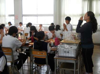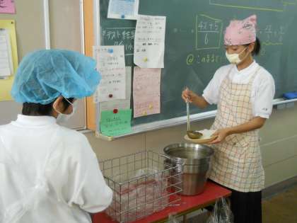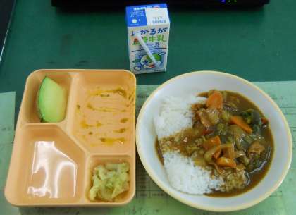 今日の給食は夏野菜のカレーライスでした。やっぱりカレーは人気メニューのようです。食缶による温かい汁物提供にも大分慣れてきましたが、4時間目終了から食べ始めまで12〜18分かかりました。