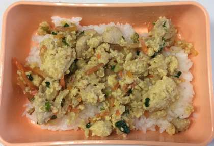 副食容器の「親子丼の具」をご飯にのせて食べることができます。 -