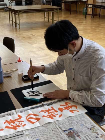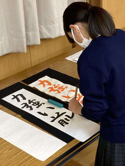 2022年最初の書道教室が行われました。元気アップの方に指導していただき、書き初めを行いました。今回は行書体に挑戦しました。苦労しながらも、一生懸命練習して、それぞれの作品を完成させました。よく頑張りました。