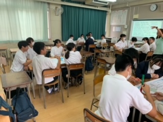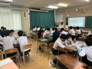 本日22日の6時間目、2年生では防災学習の一環として、「自分たちが住んでいる地域が災害に遭ったとき、役に立つものや施設」という内容で調べ学習を行いました。各クラス班に別れて活発な意見交換を行い、災害時の行動について真剣に考えることができました。