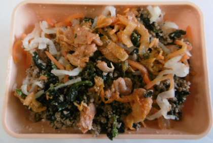 副食容器の具材(肉炒め・ほうれん草・ナムル・豚キムチ)を温かいご飯にのせていただきます。