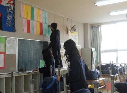 1年生は、5・6限、各教室で百人一首大会の練習を行いました。CDを流したり、生徒が読み上げたりとクラスによってやり方はいろいろ。クラスの個性がわかりますが、みんな結構覚えていたようです。本番の1月16日(金)に向けて冬休みも各自で練習してください。