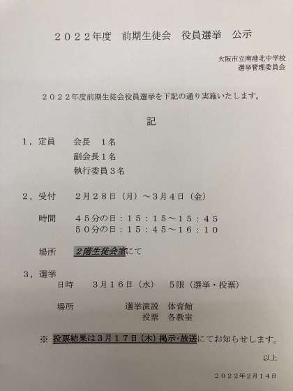 本日、全校集会が行われました。感染症対策でTeamsでの配信となりました。その中で、2022年度前期生徒会役員選挙の公示がありました。来年度、南港北中学校をより良いものにしていくために頑張ってもらう1,2年生の立候補を期待しています!