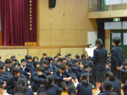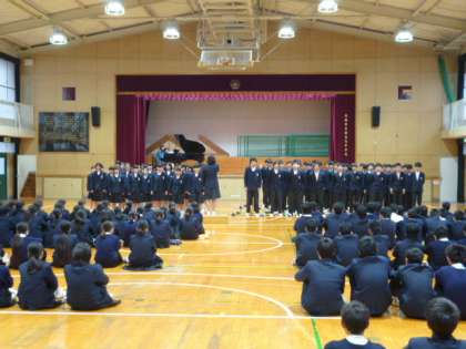 本日、全校集会の後、《3年生を送る会》が催されました。在校生のあいさつと歌、3年生のあいさつと歌、そして、お見送りという流れでした。先輩たちのバトンがしっかりと後輩たちに渡されました。素晴らしい歌声が体育館に響いて、とても感動的な会となりました。3年生の皆さん。後輩たちの励ましに応えられるよう、これからの生活も頑張ってください。