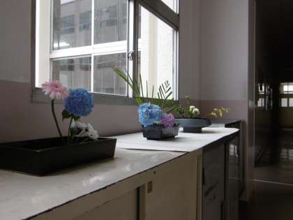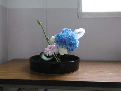 華道部の生け花を、また公開します。今回は紫陽花が中心です。堪能してください。写真撮影の技術が未熟で、うまく撮れていません。ご容赦ください。