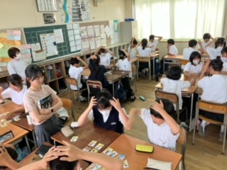 1年生の英語の授業は、英語を聞き取って絵カードをとる「かるた」をしていました。ルールを守って楽しく競い合っていました。
