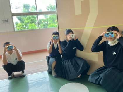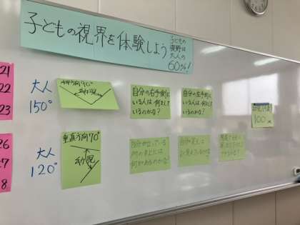 3年生の家庭科では、2学期予定の保育実習に向けて「子どもの視界を体験しよう」という授業をしていました。子どもの視野は大人の60%だということで、子どもは視界が狭くて自分たちほど見えていないのだということを体験しました。最後に今日の学習を踏まえて、保育実習ではどんなことができるか、何に注意しないといけないかを考えてレポートを書きました。