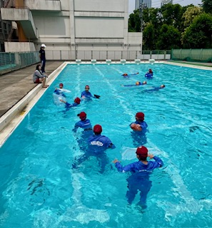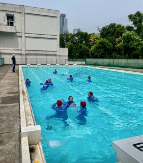 水泳の授業が始まりました。初日は着衣泳を行いました。服を着た状態で不意に水に落ちたときを想定して、浮いて呼吸を確保する練習を行いました。 -