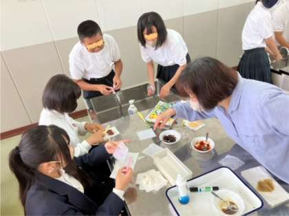 2年生の家庭科の授業では、「シミ抜きに挑戦しよう」ということで、しょうゆ、チョコソース、トマトソース、油性ペン、水性ペンの染み抜きの仕方を学び実践しました。