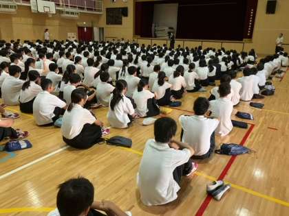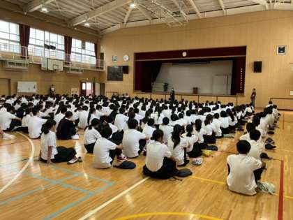 本日の全校集会は、9月1日の防災の日を受けて、「今、地震がおきました。皆さんはどう行動しますか」と校長先生から問いかけがありました。たくさんの生徒が、自分の靴袋を頭に乗せて頭をかばう姿勢をとりました。逃げる時にガラス窓の下を通らないことや周りの人をおさないようにするための距離のとり方を具体的に教えていただきました。