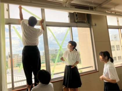 先週末に大型台風の暴風に備えて、窓ガラスに養生テープを貼りました。生徒の皆さんは、各担任の先生から前回の大型台風の時に校舎の窓ガラスが割れて、あと片付けが大変だったという話を聞いて、割れたガラスが飛び散らないようにクラスメイトと協力して窓を保護していました。