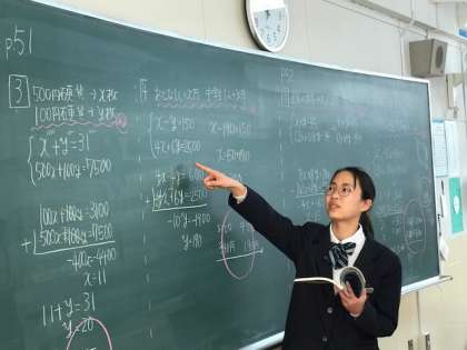8年生数学の授業での、連立方程式の文章題の解き方を説明する場面です。
