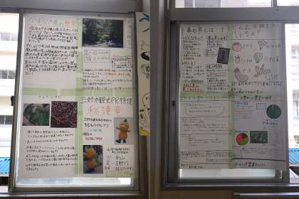 5/22に出発する、9年生の修学旅行について、教室前の廊下には、旅行先について調べたことが掲示されています。
