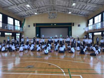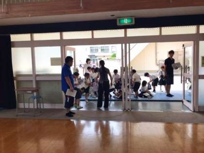 1年生が体育館にやってきました。かたや中では5・6年生が……何が始まるのかな?