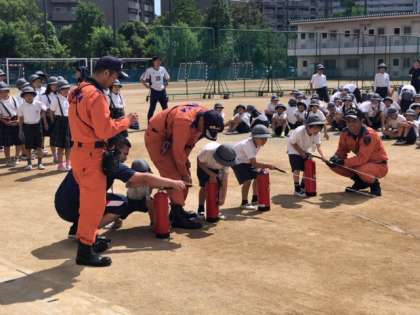 その後、グラウンドに集まって、小学生は、水消火器を使った消火訓練を行いました。