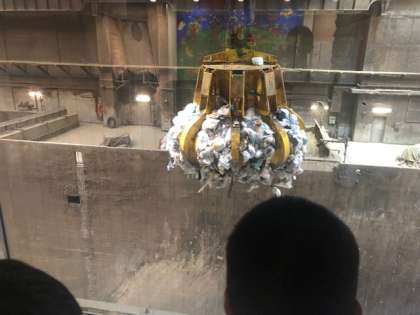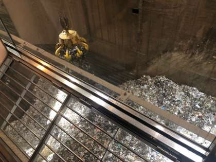 運ばれてきたごみが、ごみピットにためられています。このクレーン1つかみで、パッカー車6台分にもなるそうです。