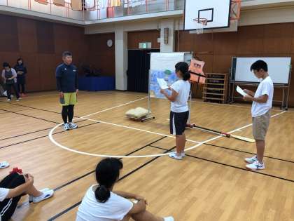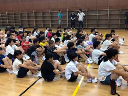入館式です。施設の方からの説明を受けています。もうすぐカヌー、カヤックの海の活動が始まりますよ。