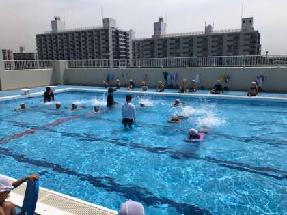 2年生のプールの授業です。ビート板を使って、前に進む練習をしています。