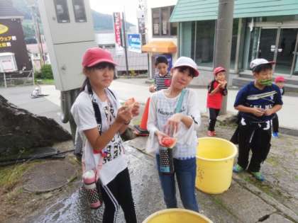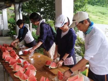 山から下りてきて、先生方が切ってくれたスイカを食べました。種がなく、とっても甘いスイカでした。