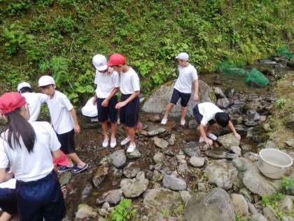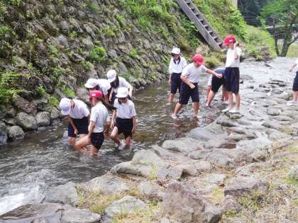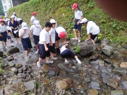 宿舎近くの川で魚掴みをしたり、川遊びをしました。川の水は、とっても冷たいです。