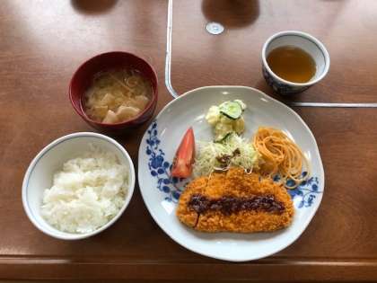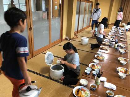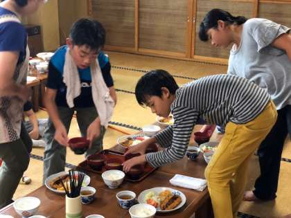 夕食の準備のため、みんなより先に食堂で準備をしています。