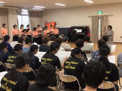 体操、発声、コーラス体験を実施し、懐かしい日本の曲やミュージカルの名曲なども多数演奏しました。