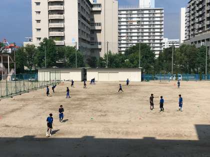 グラウンドでは、サッカー部が互いの技術向上を図り、練習が行われています。みんな日に焼けて真っ黒です。