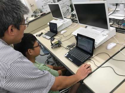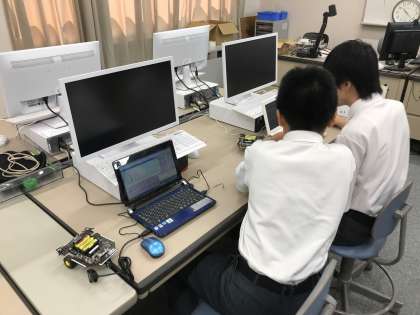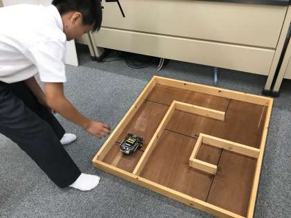 パソコン室では、迷路をクリアすべく、パソコンからロボットに動作の命令を転送して、上手くいくように試行錯誤が行われていました。