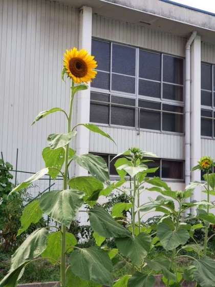 3年生の学習園のヒマワリが2メートル近くになり、花が咲きました。炎天下、プールに向かって元気に咲いています。