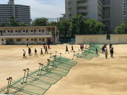 13日頃、近畿圏に上陸見込みの台風10号に備えて、防球ネットやゴールを教職員総出で行っています。