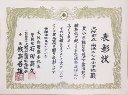 本日、南港南小学校が、交通安全の連盟表彰(優良学校)として、大阪府警、大阪府交通安全協会から、表彰を受けました。