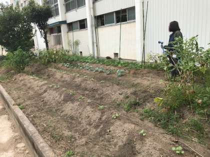 体育館横の畑では、新たに大根を植えられています。
