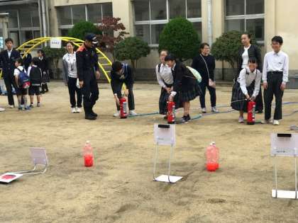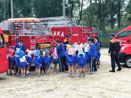 アスール幼稚園の園児達も一緒に避難訓練を行いました。水消火器の体験も。